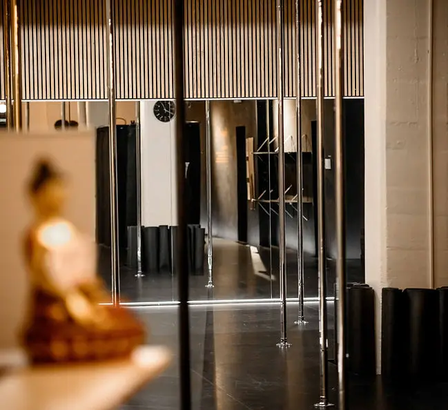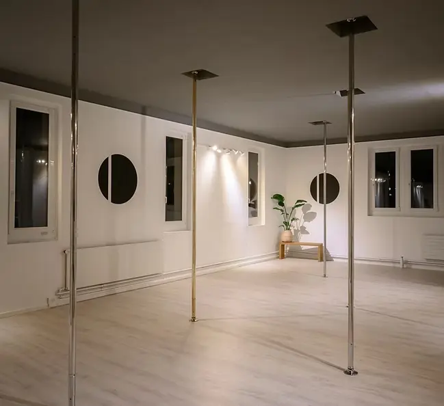 Espace fonctionnel de 60m2 dédié à la pole, à la danse et pratique au sol. Les barres de pole dance ne peuvent être enlevées ou déplacées.